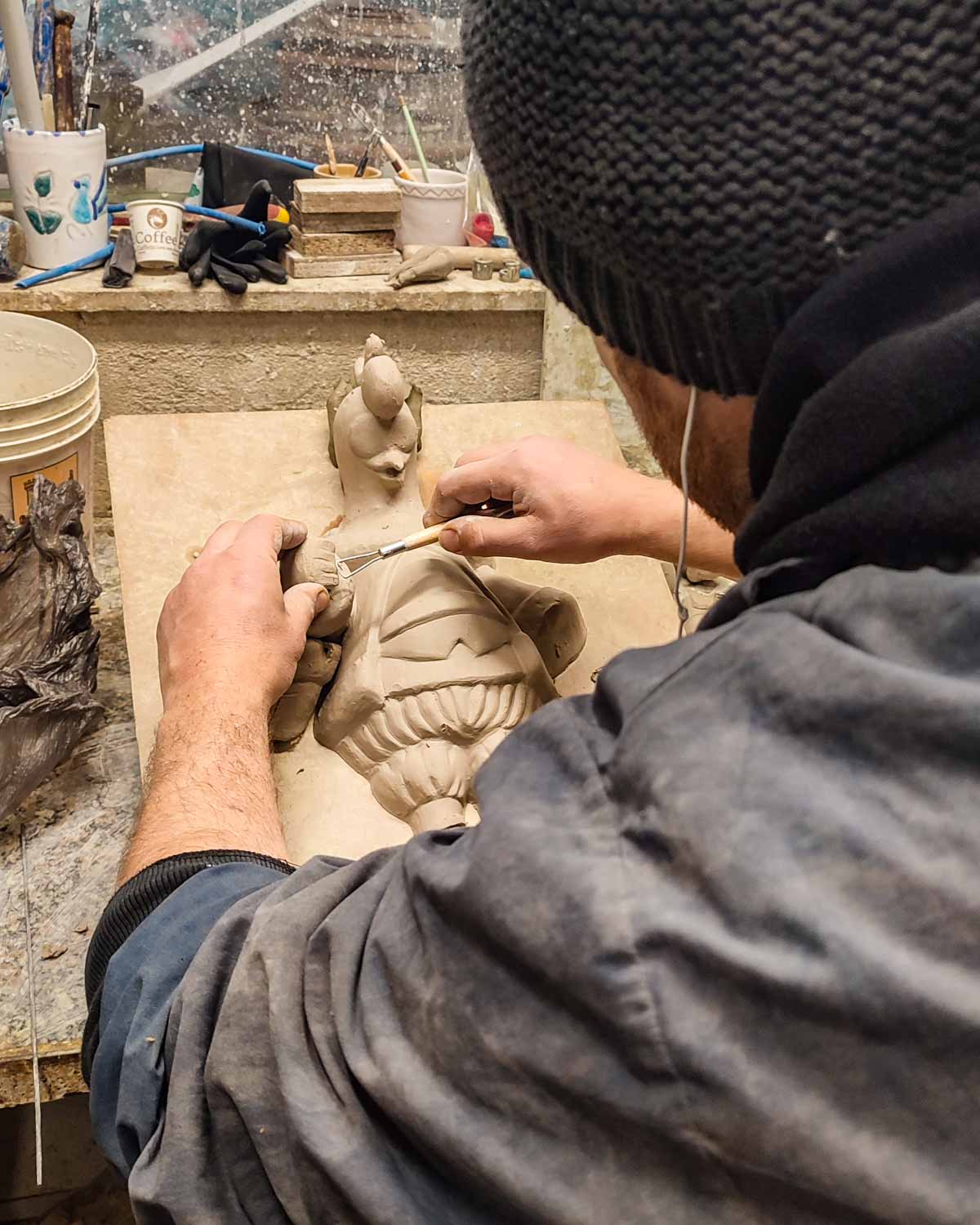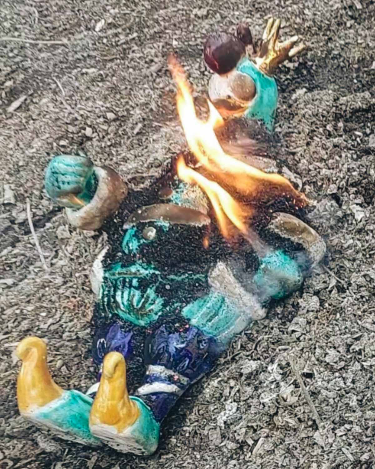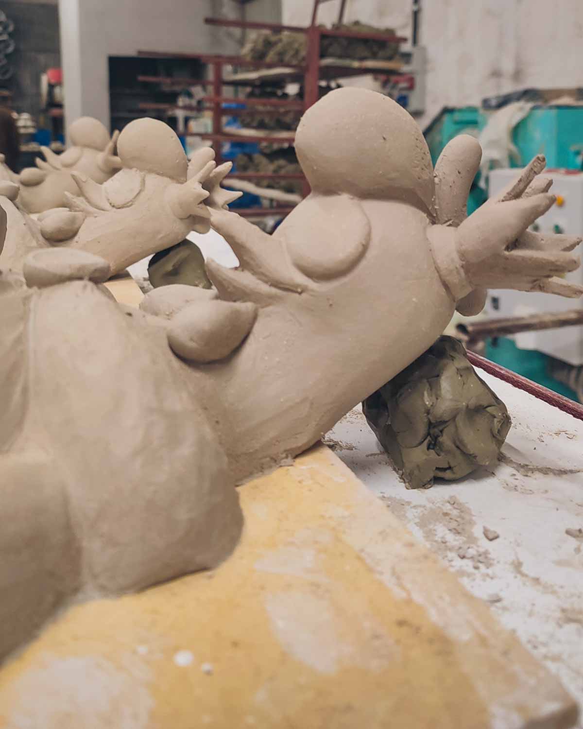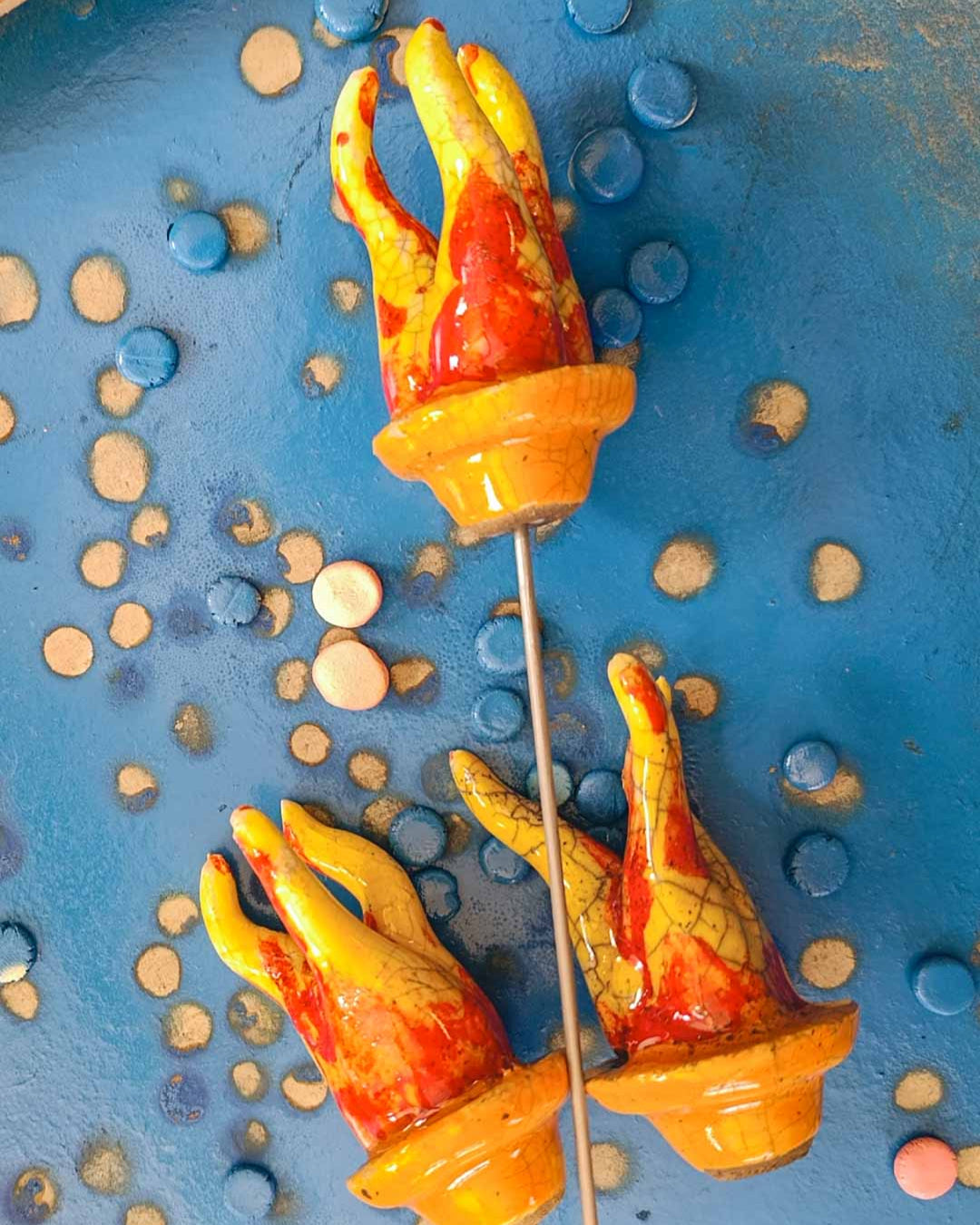 Per la creazione di questa scultura abbiamo utilizzato, tra le altre, la tecnica Raku, un'antica lavorazione della ceramica originaria del Giappone che dona un aspetto straordinario e sempre diverso a ogni pezzo. Questo processo prevede: