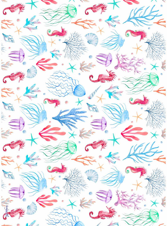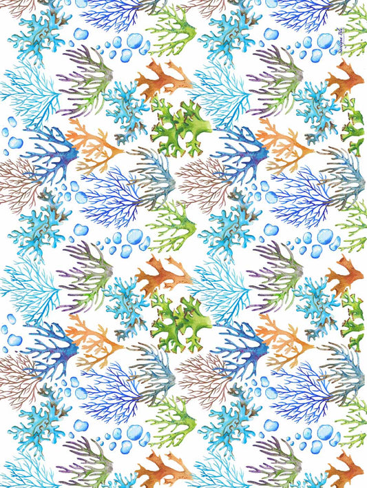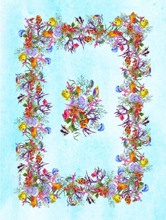tovaglie estive con grafiche marine, con pesci, tartarughe e fondali ispirati al blu del Mediterraneo;