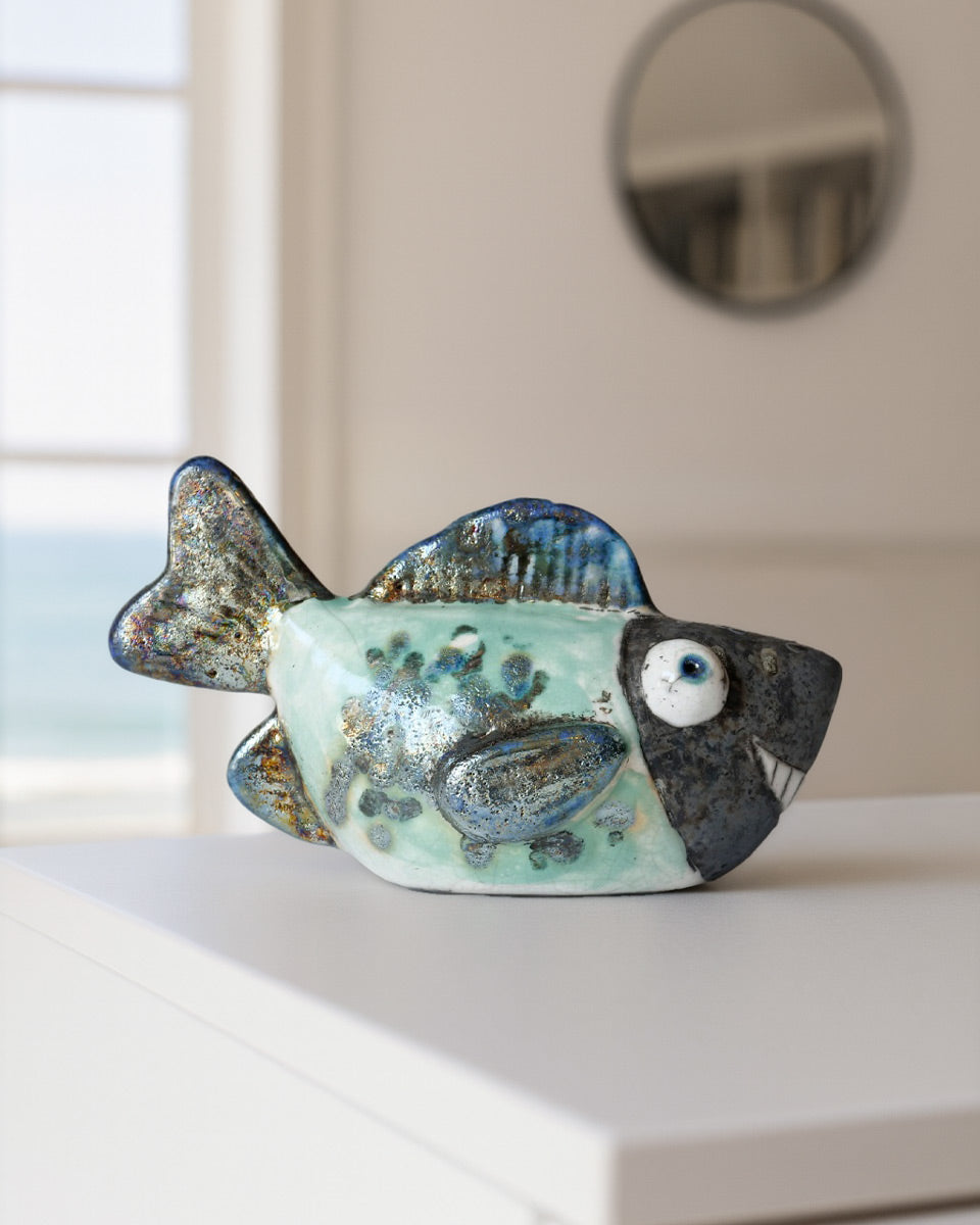 Questo processo di riduzione, reso possibile dall’assenza di ossigeno, genera superfici in cui convivono nero profondo, rame, oro e sfumature inaspettate. Ogni pezzo in raku è quindi irripetibile, risultato dell’incontro tra calore, fiamma e tempi di raffreddamento. Un pesce in raku può assumere tonalità che ricordano le profondità marine, mentre una pavoncella con riflessi metallici diventa un elemento di grande impatto estetico in un ambiente moderno.