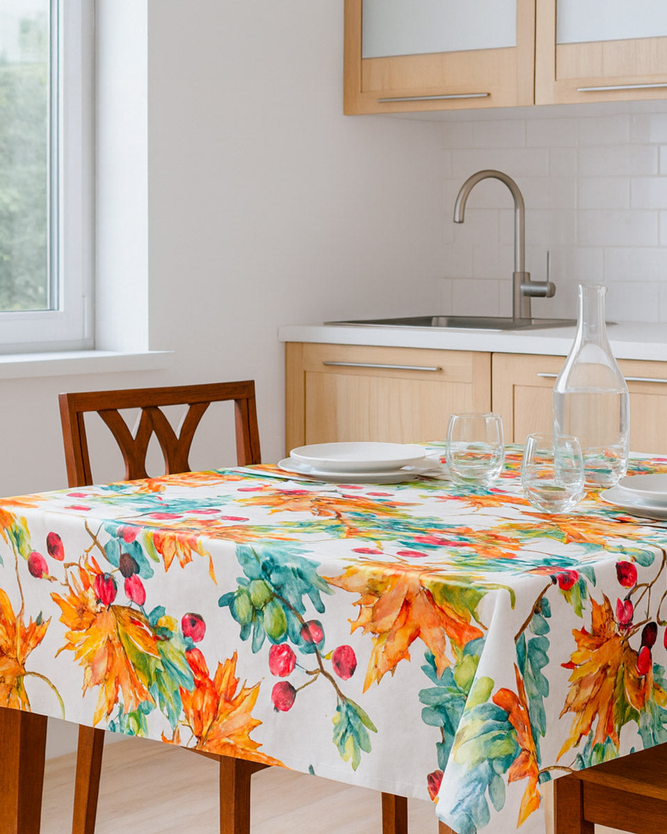 Una tovaglia autunnale si presenta con un delicato equilibrio di colori: lo sfondo chiaro o neutro fa risaltare i motivi decorativi, mentre foglie, bacche e dettagli floreali aggiungono movimento e intensità. Così la tavola diventa lo specchio della stagione: accogliente, calda e piena di armonia.