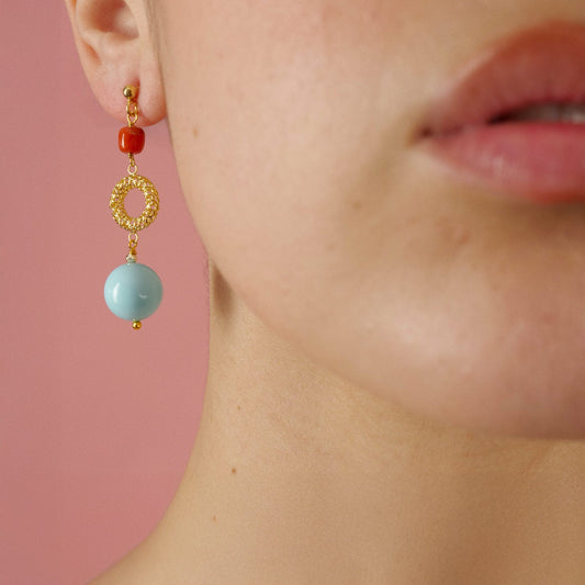 Orecchini Artigianali con Corallo e Turchese, Maglia Filigranata