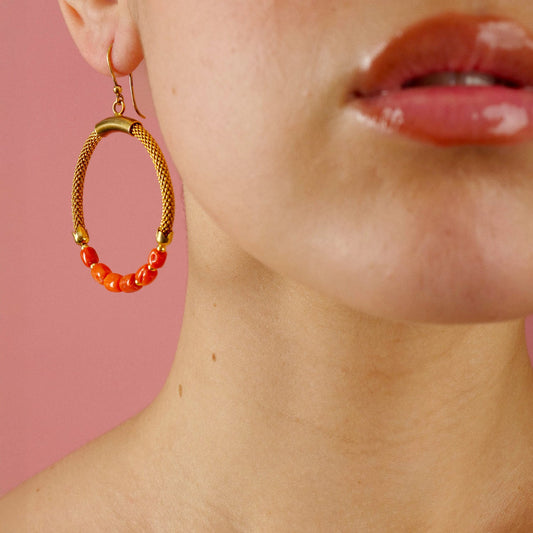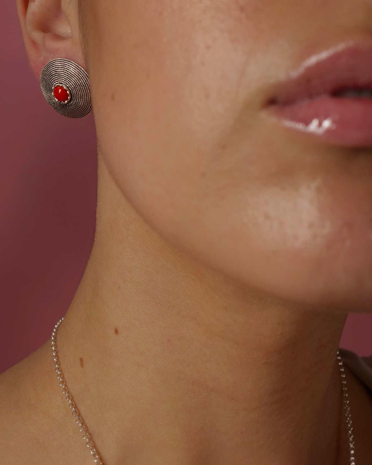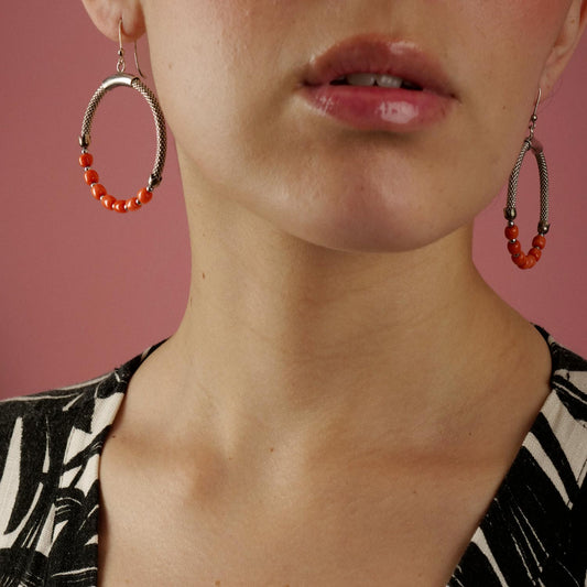Orecchini in Argento a Cerchio con Corallo e Dettagli Intrecciati