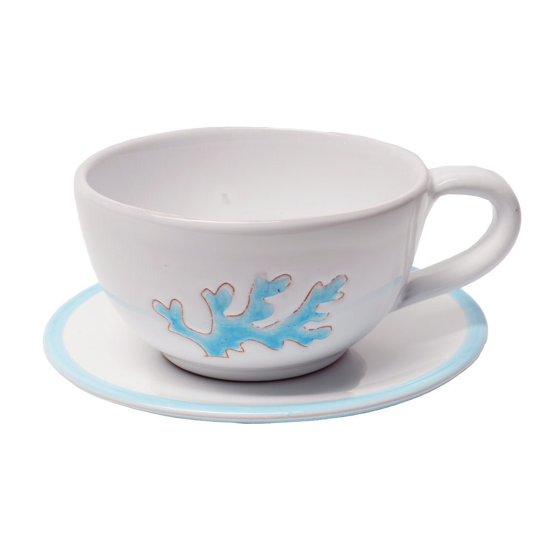 This tea cup with handle, accompanied by a saucer, will add a touch of elegance to your ceramic collections. Made of glossy white ceramic, engraved and decorated with celeste coral by artisans from our workshop in Calangianus (Sardinia, Italy). Also available in red coral.