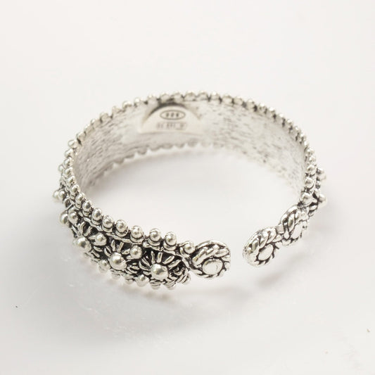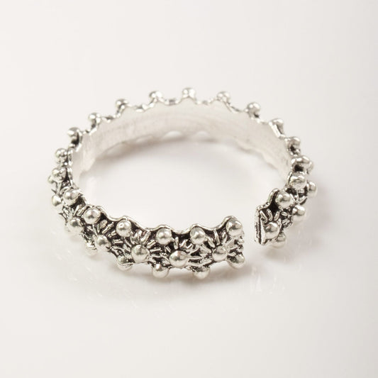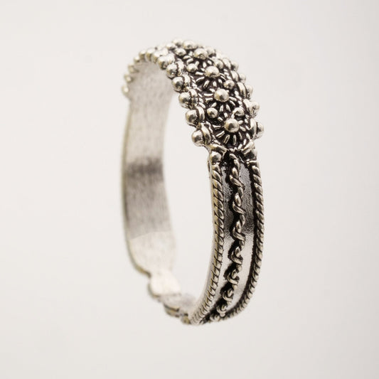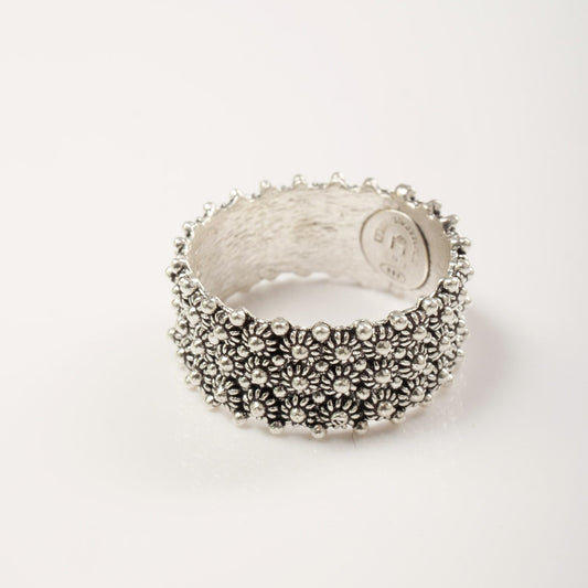 L’anello si distingue dalla grandezza della granulazione dei pallini che si susseguono in file parallele o per il diverso orientamento delle foglioline (simili a virgolette) che chiudono e determinano l’andamento curvilineo del disegno, paragonabile a un merletto.
