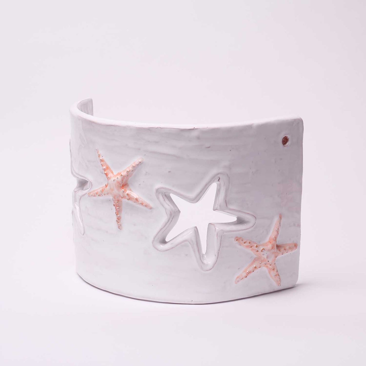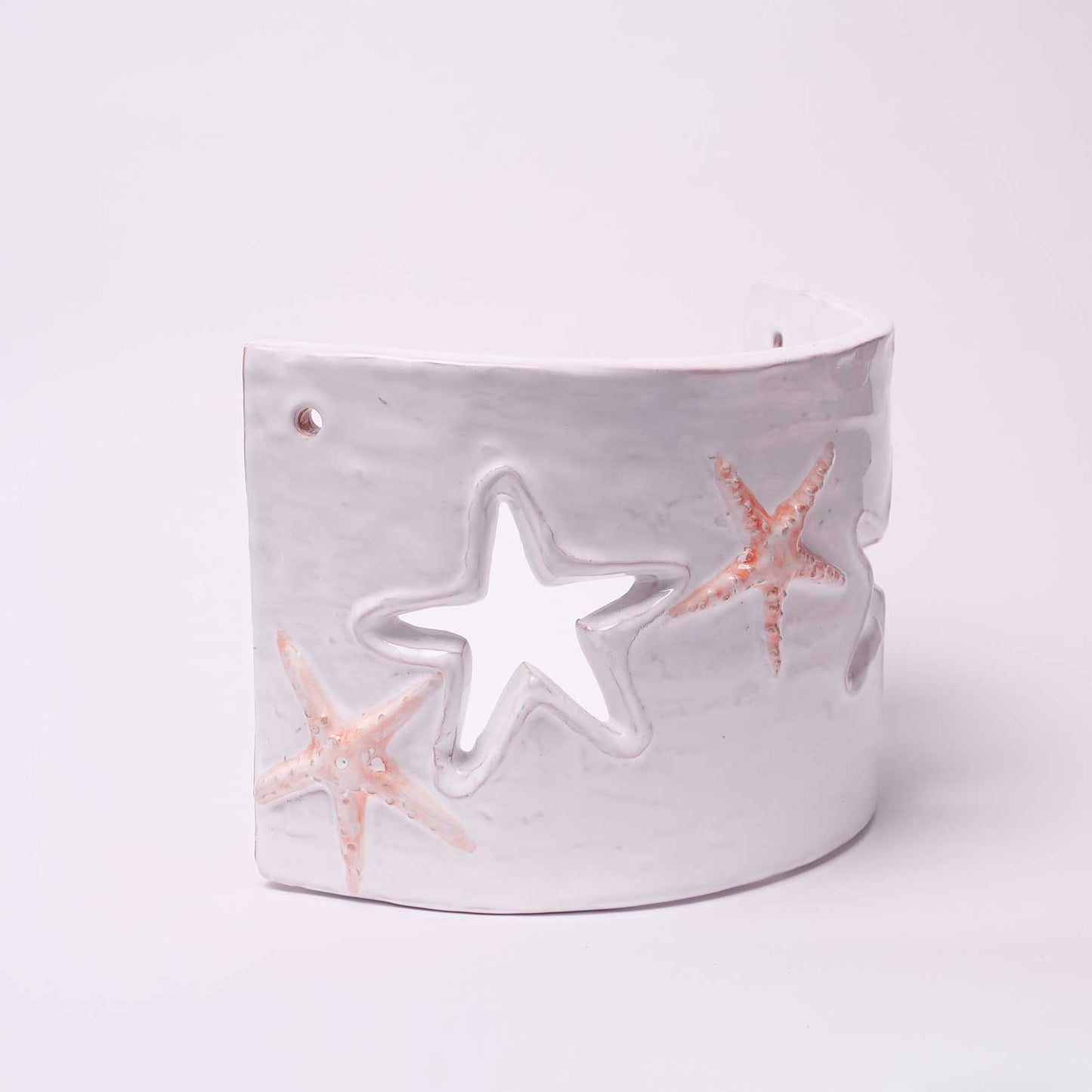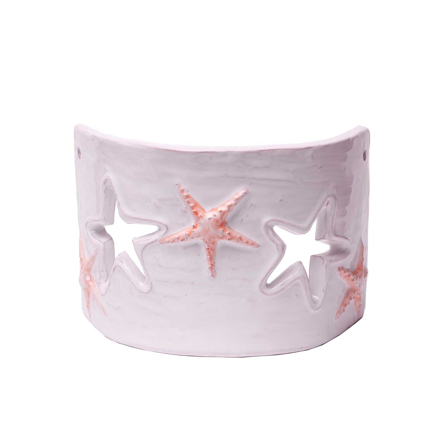 Applique in ceramica, della collezione Rilievo, realizzata e decorata a mano con la tecnica del rilievo dagli artigiani del nostro laboratorio di Calangianus, in Sardegna, riporta la decorazione di stelle marine dal color salmone. Questo pezzo si adatta perfettamente a tutti quegli angoli delle nostre case a cui si vuole donare un tocco di luce e creare un ambiente intimo e accogliente.