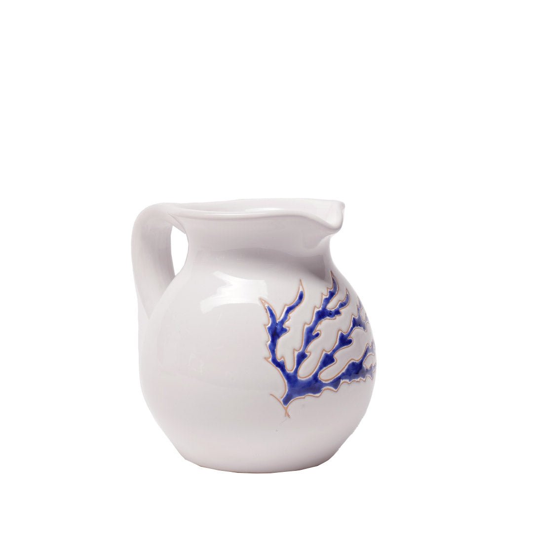 Brocca realizzata in ceramica, modellata al tornio, di smalto lucido bianco con incisione e decorazione del tradizionale corallo, raffigurato dal colore blu, il tutto realizzato dagli artigiani del nostro laboratorio di Calangianus, in Sardegna.