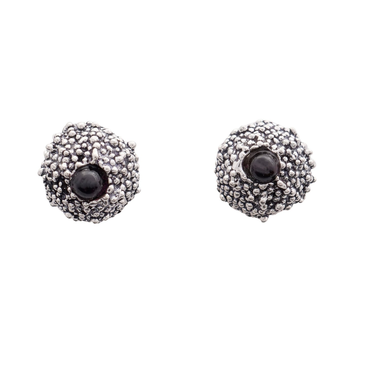 Coppia di orecchini a lobo, realizzati in Sardegna, in filigrana di argento arricchiti da una pietra nera.