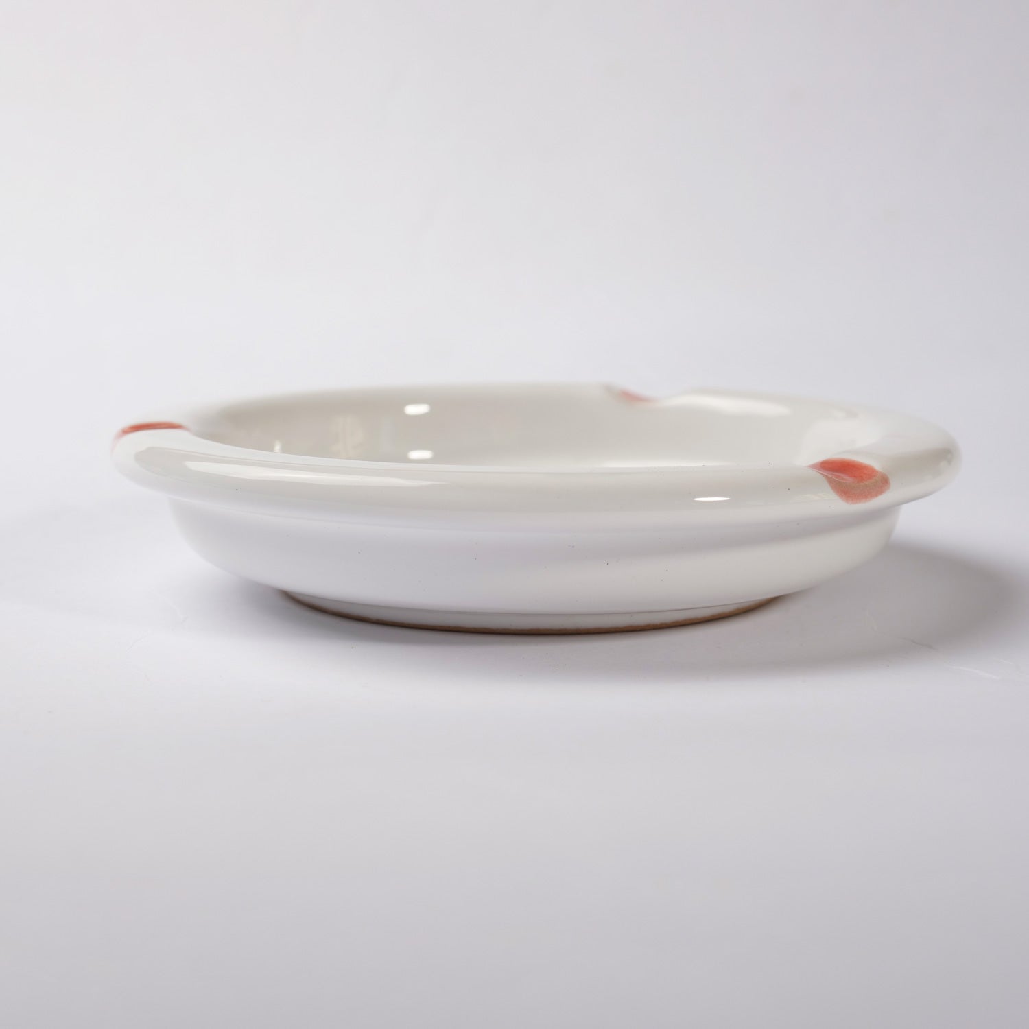 Questo posacenere in ceramica, realizzato a mano dagli artigiani di Calangianus, unisce tradizione e funzionalità. Rifinito con smalto bianco lucido, è decorato con motivo corallo rosso dipinto a mano, simbolo di protezione nella cultura sarda e utilizzato fin dall’antichità negli amuleti.